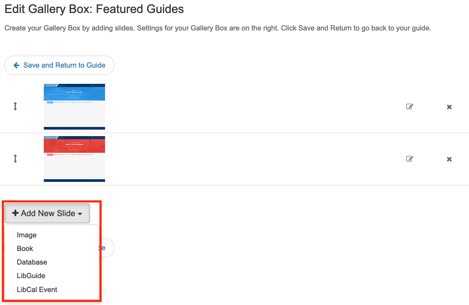 - On the Edit Gallery Box: Featured Guides screen, click Add New Slide and select LibGuide.